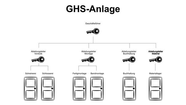 Eine GHS-Anlage (General-Hauptschlüssel-Anlage) ist in größeren Objekten mit mehreren Abteilungen vorzufinden.